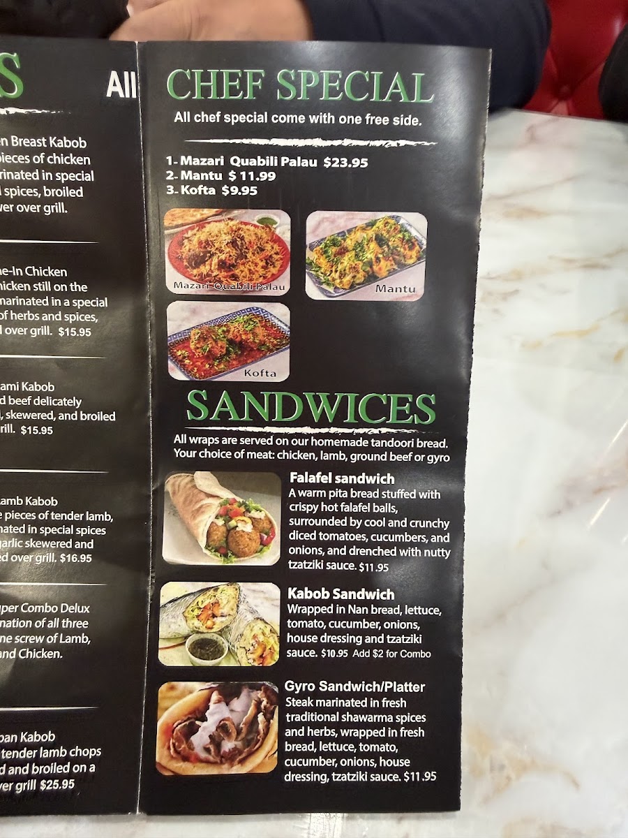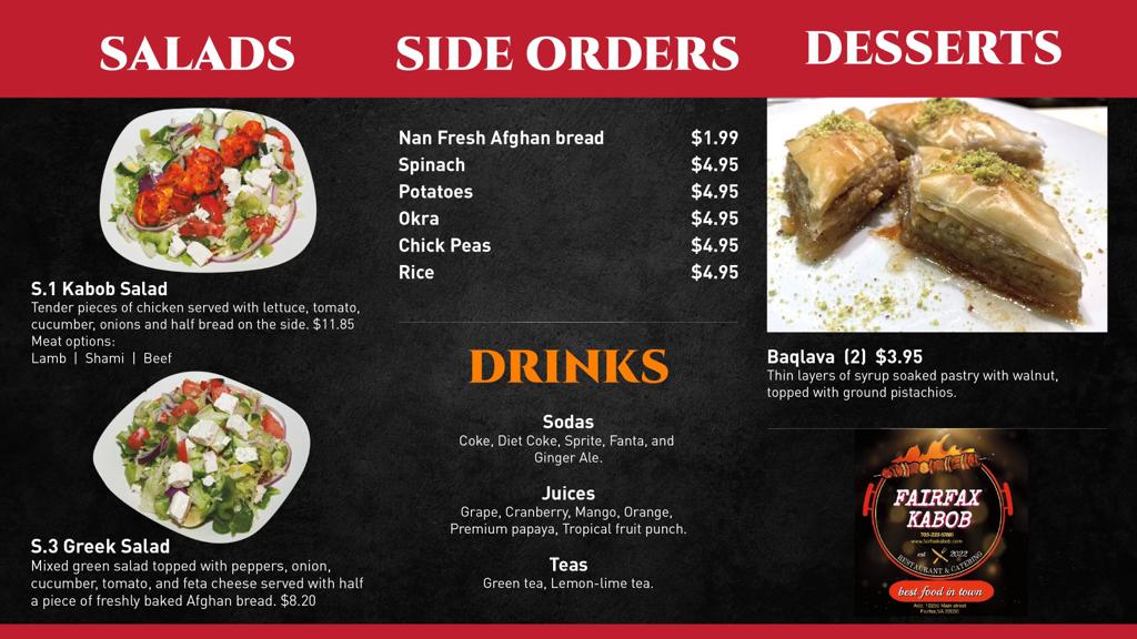 Fairfax Kabob offers a rich tapestry of Middle Eastern and Afghan flavors that truly stand out in Fairfax, VA. Their menu centers around authentic dishes crafted with care and tradition, featuring highlights like the Kabob Sandwich wrapped in fresh Nan bread, layered with crisp lettuce, tomato, cucumber, onions, house dressing, and creamy tzatziki sauce. For a heartier meal, the Kabob Sandwich Combo pairs this with a side from their diverse buffet selections, including silky Spinach, perfectly seasoned Potatoes, and fragrant Rice.